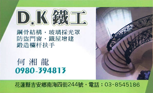 D.K鐵工廠位於花蓮縣吉安鄉,成立至今已累積多年的鐵工工程經驗,包含鋼構工程、裝潢工程、鋼骨結構設計、玻璃探光罩、鐵皮屋、頂樓增建、防盜門窗、鍛造欄杆扶手、金屬製品訂做、創意鍛造、造型天花板、貨櫃屋搭建等工程,各式工程都是由師傅級的團隊組成,並且皆由老闆親自帶班,採用創新的工法,要求施工品質與技術,提供客戶最完善的服務。